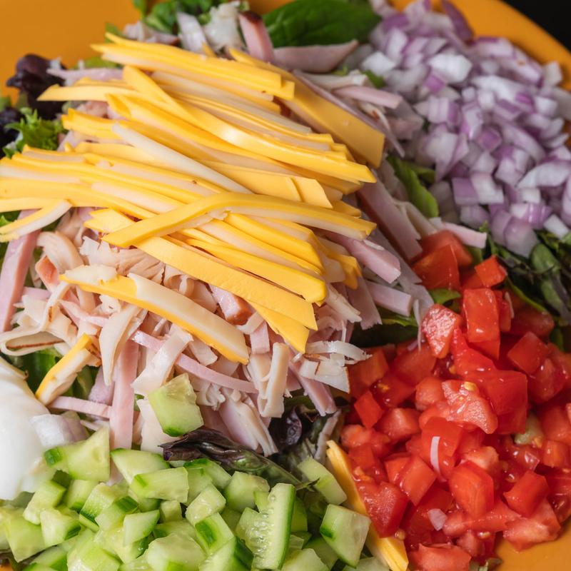 Tossed garden greens topped with ham, turkey, Swiss & American cheese, tomato, cucumber, & hard-boiled egg.