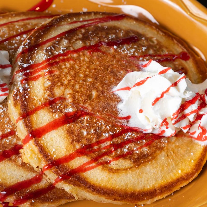 3 thick sweet cream pancakes. Add chocolate chips or bananas for an additional price.