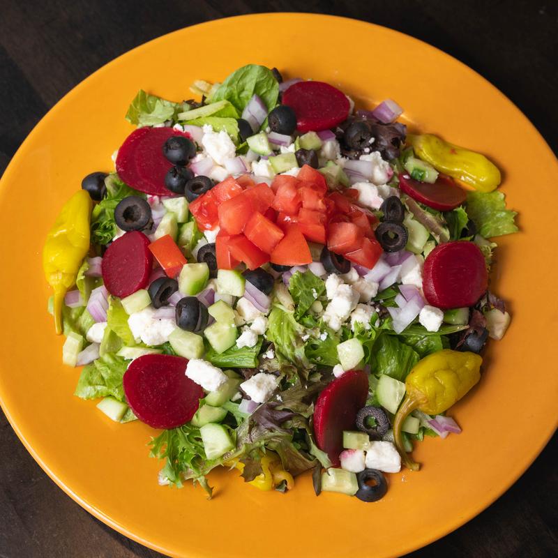 Mixed greens, tomato, cucumber, hard-boiled egg, red onion.