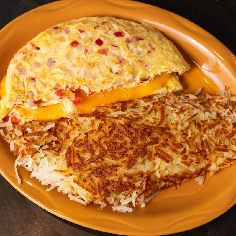 Two eggs, hash browns, choice of cheese included | Add up to 5 items: Green Pepper, Onion, Tomato, Jalapenos, Spinach, Mushrooms, Bacon, Sausage, Ham, Liver Mush, Turkey Bacon, or Turkey Sausage.